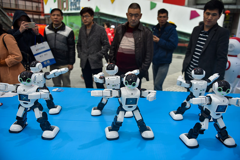 1月14日,市民在開街后的深圳華強北觀看機器人表演。