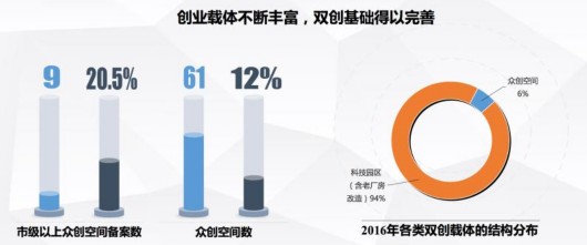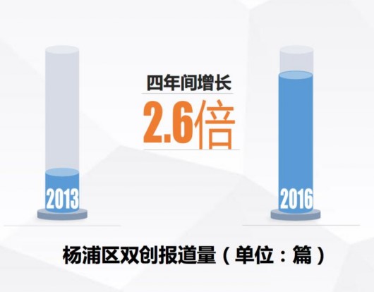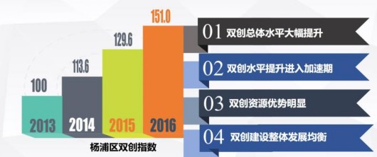 經(jīng)過(guò)指標(biāo)測(cè)算顯示,以2013年作為基期,楊浦區(qū)“雙創(chuàng)指數(shù)”從2013年的100(基期賦值)上升至2016年的151.0,增幅高達(dá)51%。其中,2016年較上年增長(zhǎng)16.5%,成為歷年增速增長(zhǎng)高的一年,雙創(chuàng)發(fā)展增速逐年提升。此外,各分項(xiàng)指數(shù)也均有提高,其中以雙創(chuàng)影響指數(shù)增長(zhǎng)為強(qiáng)勁,從2013年的100增長(zhǎng)到了2016年的153.1,較上年增長(zhǎng)22.8%。“雙創(chuàng)影響力和成果的增幅比要素和環(huán)境明顯,這也表明,創(chuàng)新的要素和環(huán)境需要長(zhǎng)時(shí)間的投入來(lái)改善,創(chuàng)新創(chuàng)業(yè)的發(fā)展需要積極進(jìn)取,還需要厚積薄發(fā)、沉得住氣。”楊浦區(qū)發(fā)改委張?zhí)鞜槺硎尽?bào)告顯示,近年來(lái)?xiàng)钇謪^(qū)各類雙創(chuàng)載體面積(含老廠房改造)持續(xù)擴(kuò)大,截至2016年,楊浦區(qū)各類雙創(chuàng)載體面積已達(dá)到162.3萬(wàn)平方米,其中,科技園區(qū)(含老廠房改造)面積占據(jù)各類雙創(chuàng)載體總面積的94.3%。同時(shí),如長(zhǎng)陽(yáng)創(chuàng)谷等園區(qū)的品牌效應(yīng)逐漸形成和擴(kuò)散,服務(wù)能級(jí)不斷提升。與此同時(shí),市級(jí)以上眾創(chuàng)空間備案數(shù)占上海比例呈逐年上升態(tài)勢(shì)。至2016年,楊浦已初步建成各類“眾創(chuàng)空間”61家,約占上海市總量的12%。其中,國(guó)家級(jí)眾創(chuàng)空間授牌為9家,占全市的20.5%;市級(jí)眾創(chuàng)空間授牌為16家,占全市的14%。