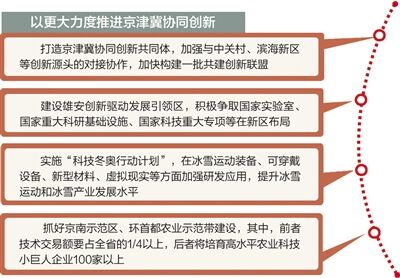 為加速“京津研發(fā)、河北轉(zhuǎn)化”,今年,河北省將以更大力度推進(jìn)京津冀協(xié)同創(chuàng)新。打造京津冀協(xié)同創(chuàng)新共同體,加強(qiáng)與中關(guān)村、濱海新區(qū)等創(chuàng)新源頭的對(duì)接協(xié)作,加快構(gòu)建一批共建創(chuàng)新聯(lián)盟;建設(shè)雄安創(chuàng)新驅(qū)動(dòng)發(fā)展引領(lǐng)區(qū),積極爭(zhēng)取國(guó)家實(shí)驗(yàn)室、國(guó)家重大科研基礎(chǔ)設(shè)施、國(guó)家科技重大專項(xiàng)等在新區(qū)布局;實(shí)施“科技冬奧行動(dòng)計(jì)劃”,在冰雪運(yùn)動(dòng)裝備、可穿戴設(shè)備、新型材料、虛擬現(xiàn)實(shí)等方面加強(qiáng)研發(fā)應(yīng)用,提升冰雪運(yùn)動(dòng)和冰雪產(chǎn)業(yè)發(fā)展水平;抓好京南示范區(qū)、環(huán)首都農(nóng)業(yè)示范帶建設(shè),其中,前者技術(shù)交易額要占全省的1/4以上,后者將培育高水平農(nóng)業(yè)科技小巨人企業(yè)100家以上。