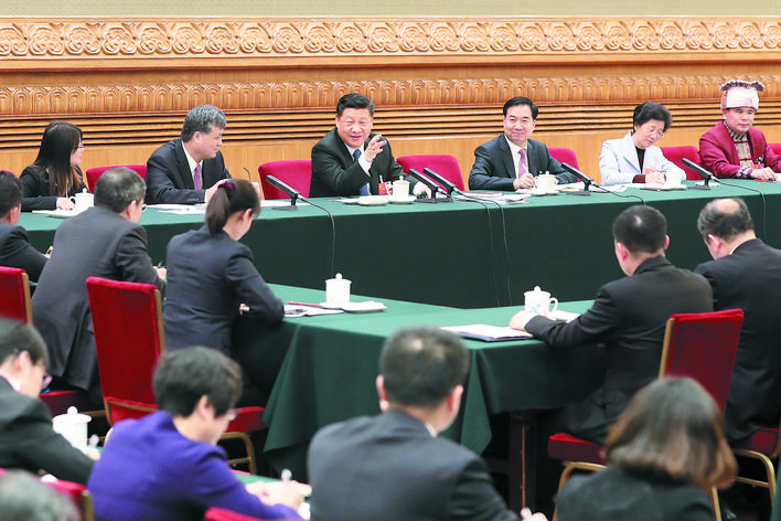 3月7日,中共中央總書記、國家主席、中央軍委主席習近平參加十三屆全國人大一次會議廣東代表團的審議。新華社發(盛佳鵬攝)