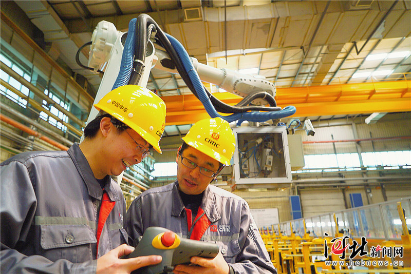 近日,中車唐山機(jī)車車輛有限公司鋁合金廠高級技師張雪松(右)和同事調(diào)試動車組鋁合金車體側(cè)墻焊縫自動打磨機(jī)器人。記者劉禹彤?dāng)z