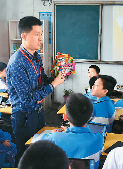 4月23日,江西省新余市分宜縣的執法人員在分宜縣小學向學生講解盜版書籍的鑒別方法。周亮攝(人民視覺)