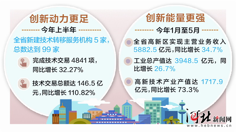 ——創新動力更足。今年上半年,全省新建技術轉移服務機構5家,總數達到99家;完成技術交易4841項,同比增長32.27%;技術交易總額達146.5億元,同比增長110.82%。