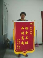 5月11日,邯鄲高科園區企業員工鄧云來到物業處,將一面寫有拾金不昧 品德高尚字樣的錦旗送到保潔工人郭愛手中,表達感激之情。 近日,園區保潔員郭愛像往常一樣,在園區樓宇間進行日常
